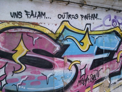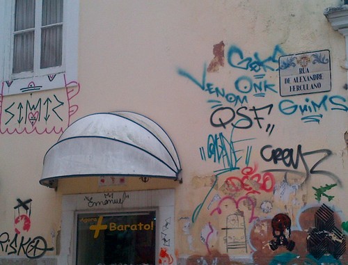 Estou com Alexandre Delgado, que hoje protesta sem rodeios no Público contra a confusão que alguns pretendem estabelecer entre grafitti e tags: os primeiros são defensáveis, os últimos não. "Quem faz grafitti de arte geralmente escolhe os locais próprios e contribui para enriquecer o espaço público. Até 'mensagens poéticas' são aceitáveis, quando feitas em edifícios devolutos. Os rabiscadores de tags não respeitam nada disso: eles são os primeiros a vandalizar grafitti artísticos (como os da Av. Fontes Pereira de Melo, em Lisboa, ou os painéis do Elevador da Glória). Não contribuem com nada, a não ser os excrementos do seu ego invasor", defende o compositor, acentuando: "Com a legislação actual, nem vale a pena fazer queixa à polícia. O Ministério da Administração Interna quer simplesmente fazer aquilo que já se devia ter feito há muito tempo: adequar a lei e criminalizar essa forma de vandalização do espaço público. É razão para aplaudir entusiasticamente. Aqui ficam duas sugestões: que a punição dos culpados inclua obrigatoriamente raspar e pintar aquilo que vandalizaram; e que se crie um imposto extraordinário sobre sprays de tinta, destinado a limpar as pichagens que tantos lucros geram a fabricantes e vendedores, e que tantos prejuízos causam a proprietários, instituições e cidadãos em geral. Esta não é uma causa de esquerda ou de direita: é uma causa de civilização contra a barbárie."