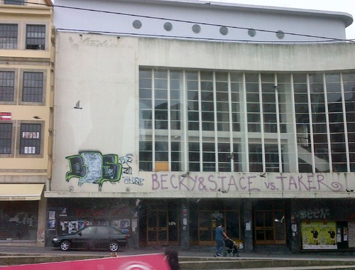Em cima, no sentido dos ponteiros do relógio: pichagens em Lisboa (Avenida de Roma), Porto (antigo cinema Batalha), na baixa de Faro e no centro das Caldas da Rainha. Fotos minhas.