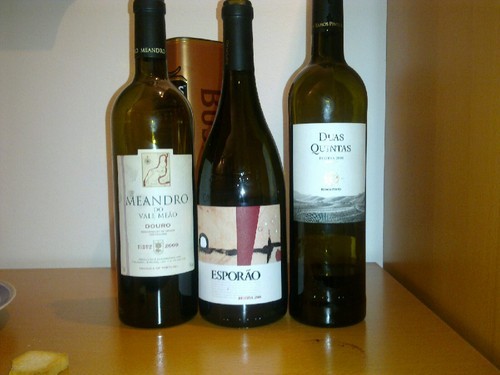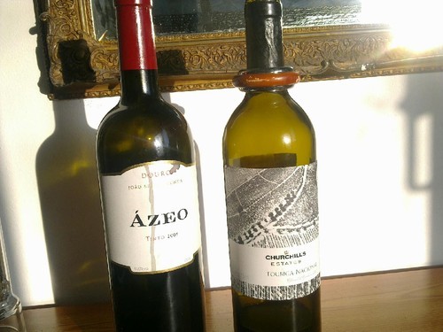Existências simples, sóbrias e contidas dos últimos dias. Destas todas, o que dizer? O Meandro é um segunda linha honesto do Meão, menos um euro e meio e seria um dos campeões do preço/qualidade deste país. O Esporão reserva é um clássico, um bom vinho que é igual a si mesmo todos os anos (não é fácil fazer um bom vinho sempre igual); o Duas Quintas reserva, edição de 2008, é um vinho à séria, embora a meu ver não aguente muito mais em garrafa, já está redondinho e aveludado, não ganha potencial nenhum e está au point. O Ázeo, cuidado com ele(!), que temos Vinho(!), assim mesmo com letra grande e exclamações. Profundo, com uma cor linda, espelha bem no sabor as virtudes da terra de onde vem. O Churchill’s Touriga Nacional puxa à casta no sabor, mas não é particularmente floral no nariz (esperava um furinho a mais deste vinho, até porque há pouco tempo bebi uma gémea desta e tenho a sensação de ter ficado com melhor impressão. Mas talvez tenha sido dominada pelo Ázeo que a antecedeu).
